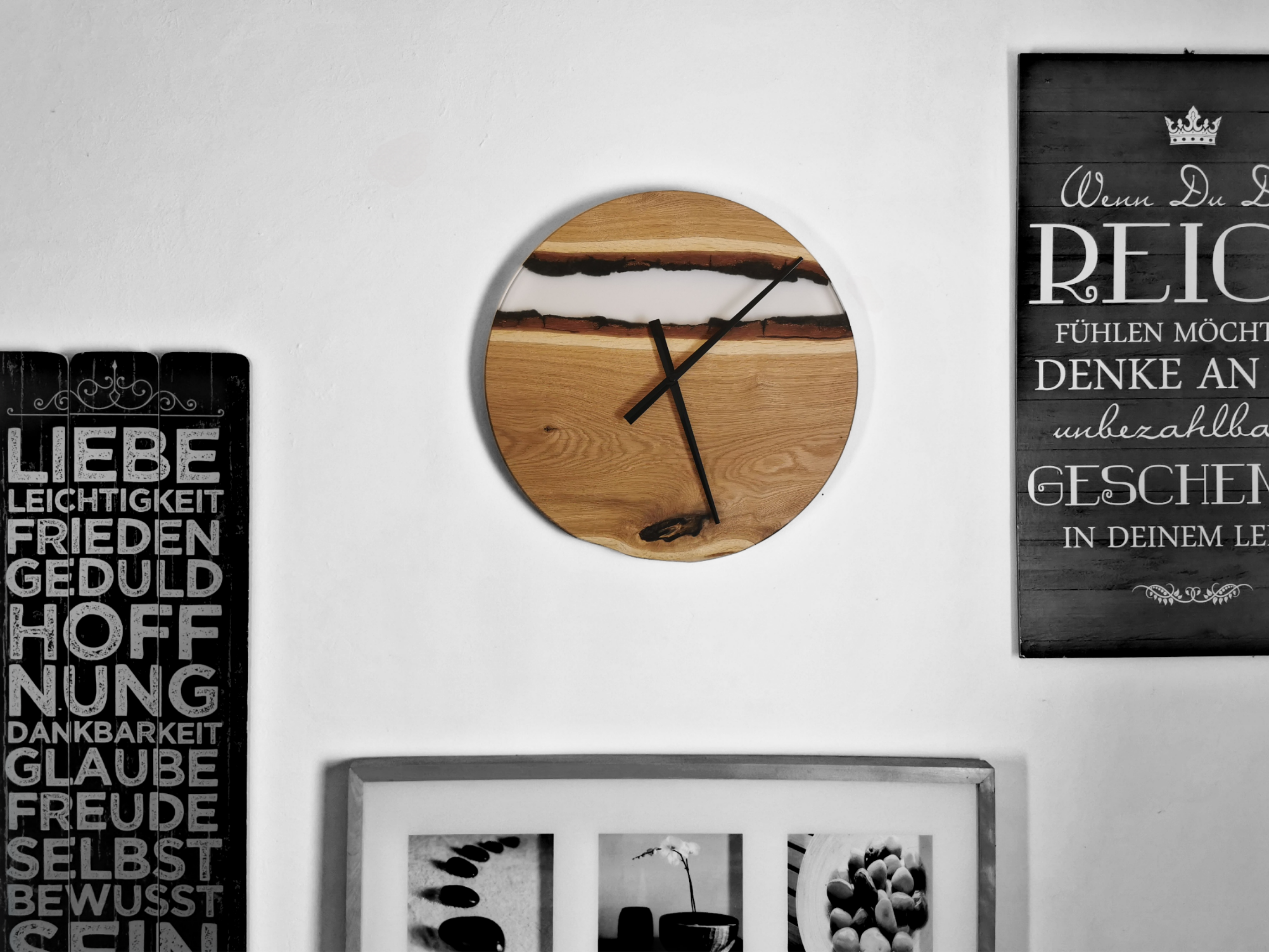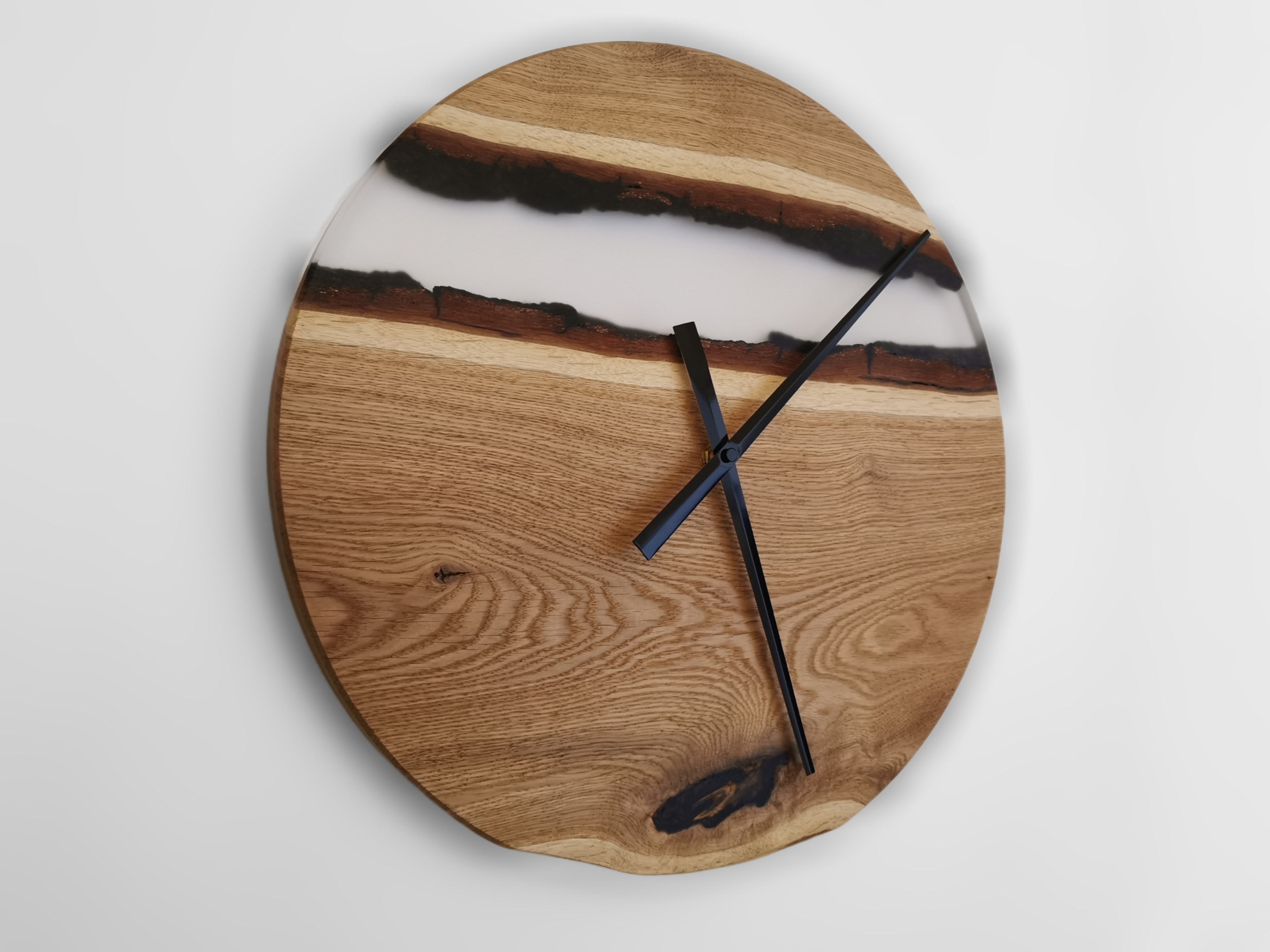 Diese einzigartige Wanduhr wurde in liebevoller Handarbeit aus Eichenholz und klarem Epoxidharz gefertigt.