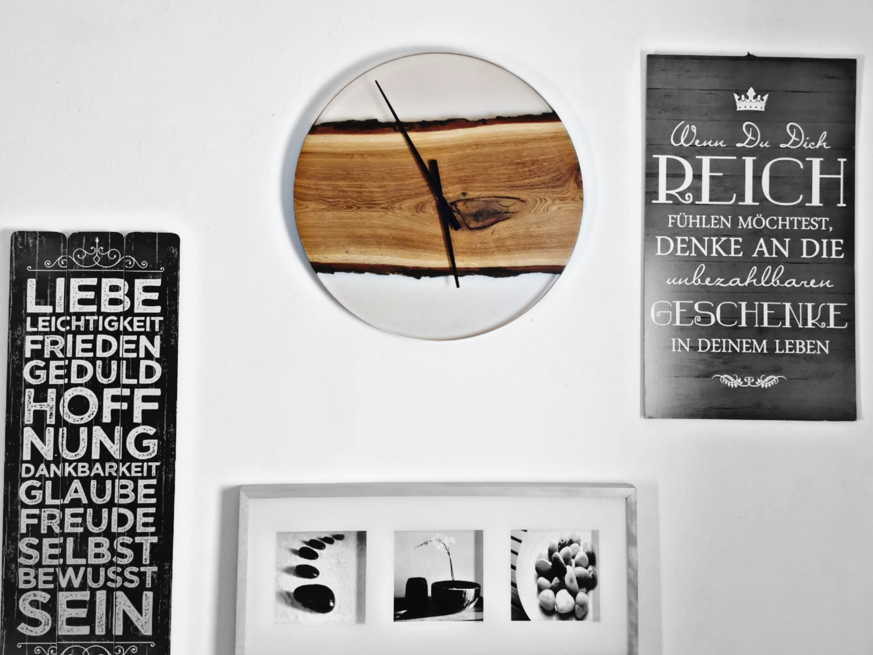 Hauptsächlich verwende ich Holz, Eisen und Epoxidharz für die sorgfältig verarbeiteten Unikate wie Möbelstücke (Uhren, Tische usw.) und Dekorgegenstände.